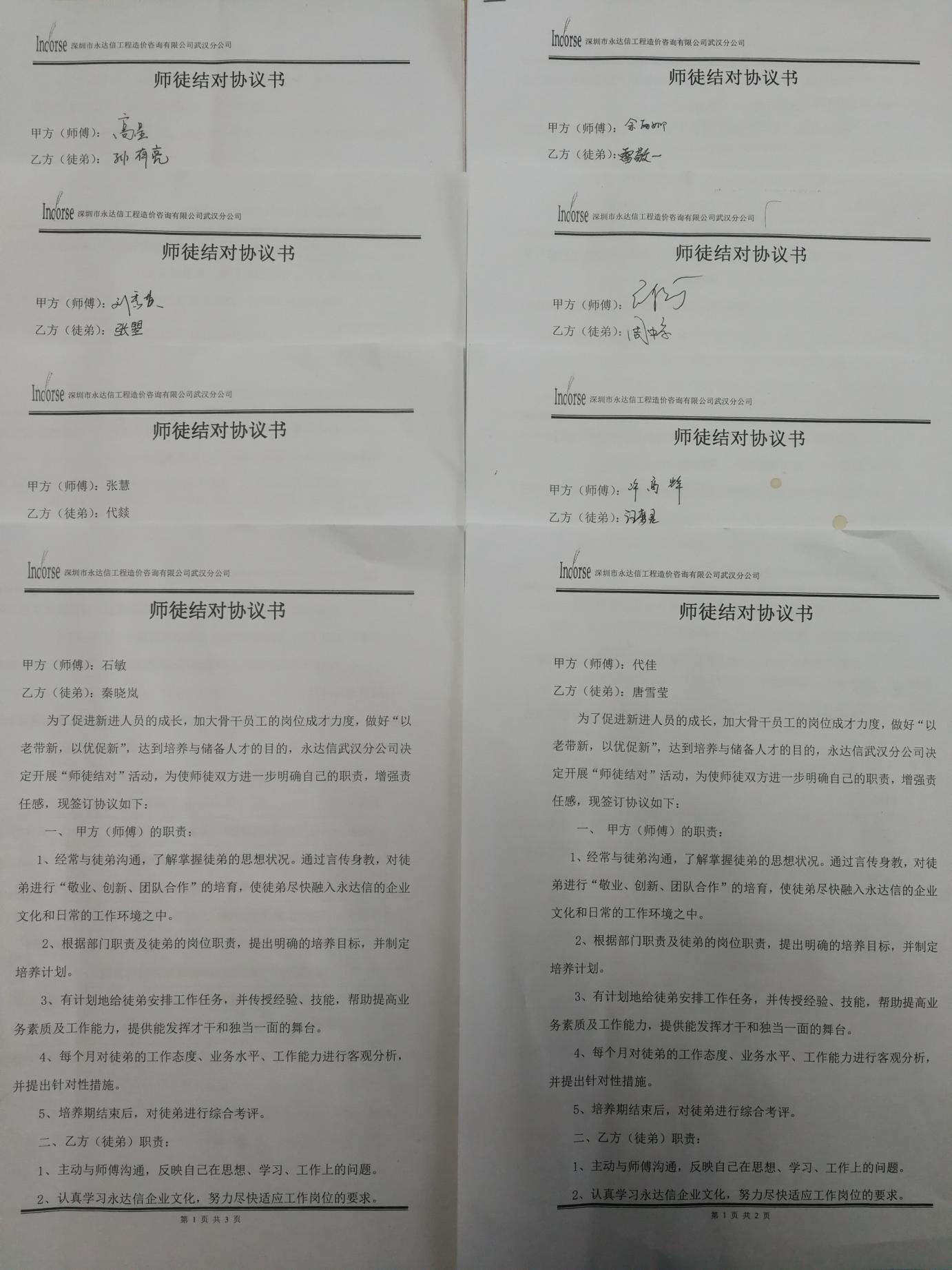 仪式最后,在大家的掌声中,八对师徒(土建三对、市政两对、安装三对)郑重地签订“师徒结对协议”,正式确定师徒关系。