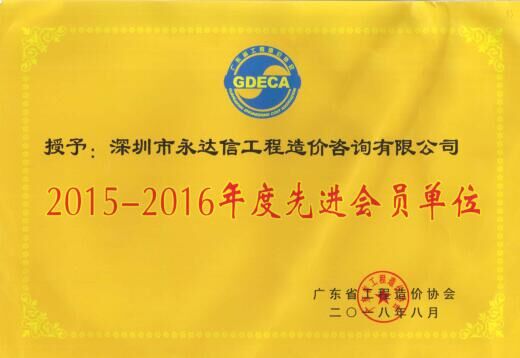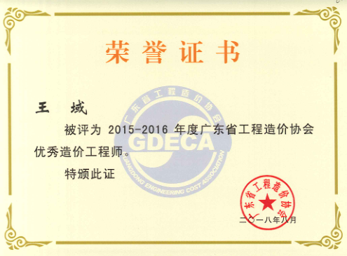 我司在广东省工程造价协会关于开展2015-2016年度先进单位会员及优秀造价工程师评选活动中荣获先进会员单位称号,我司王域同志荣获优秀造价工程师称号。