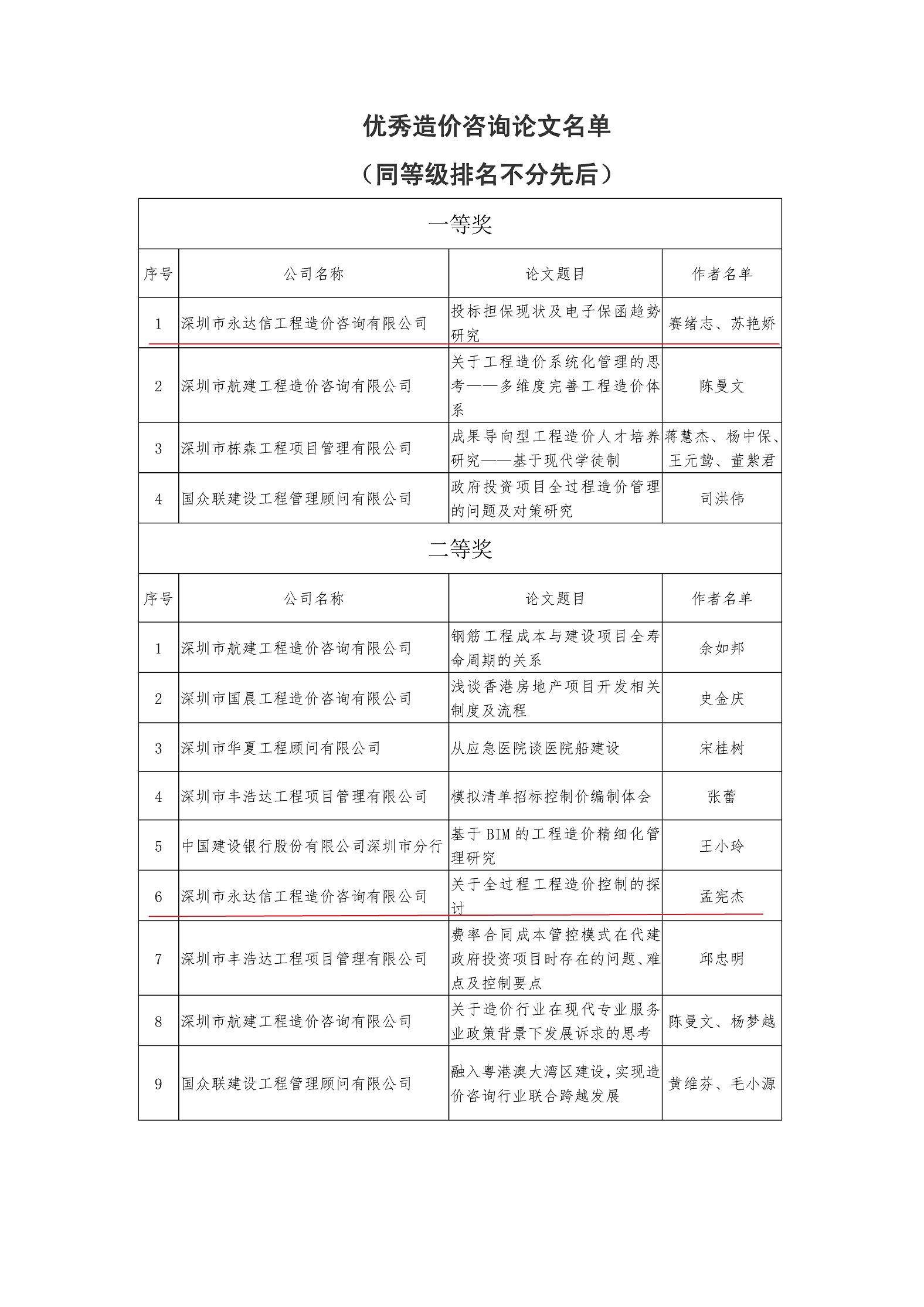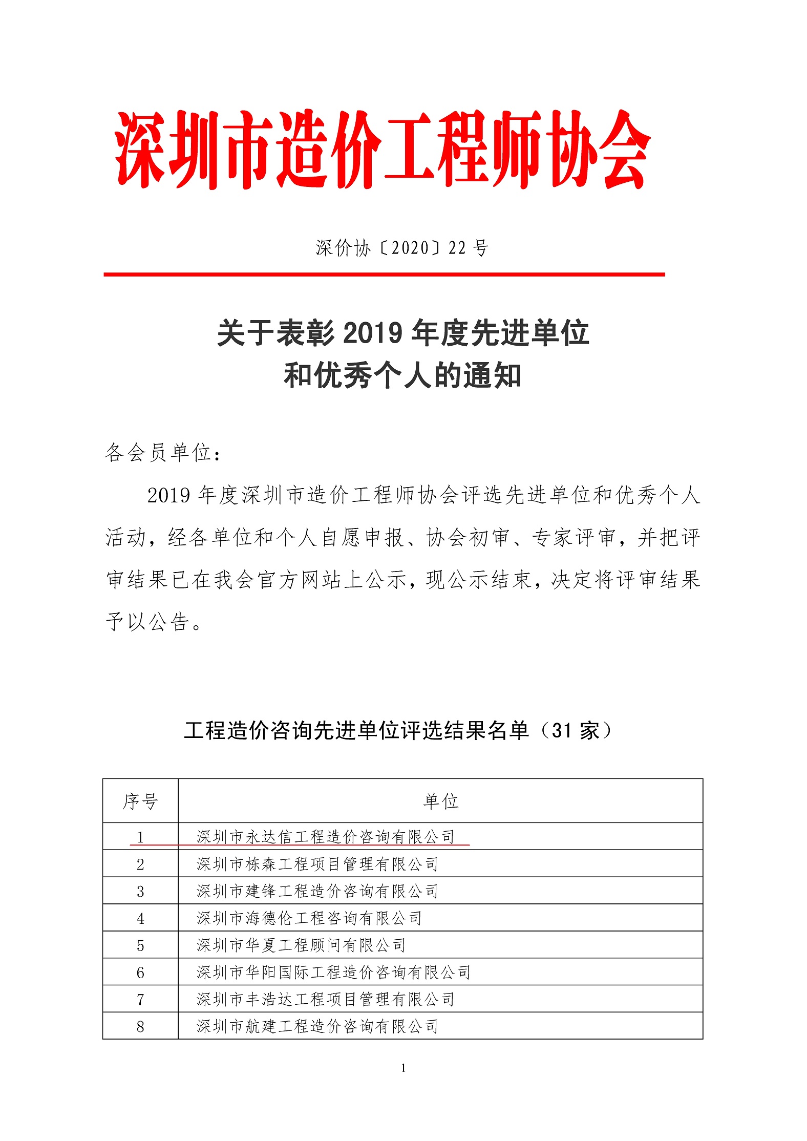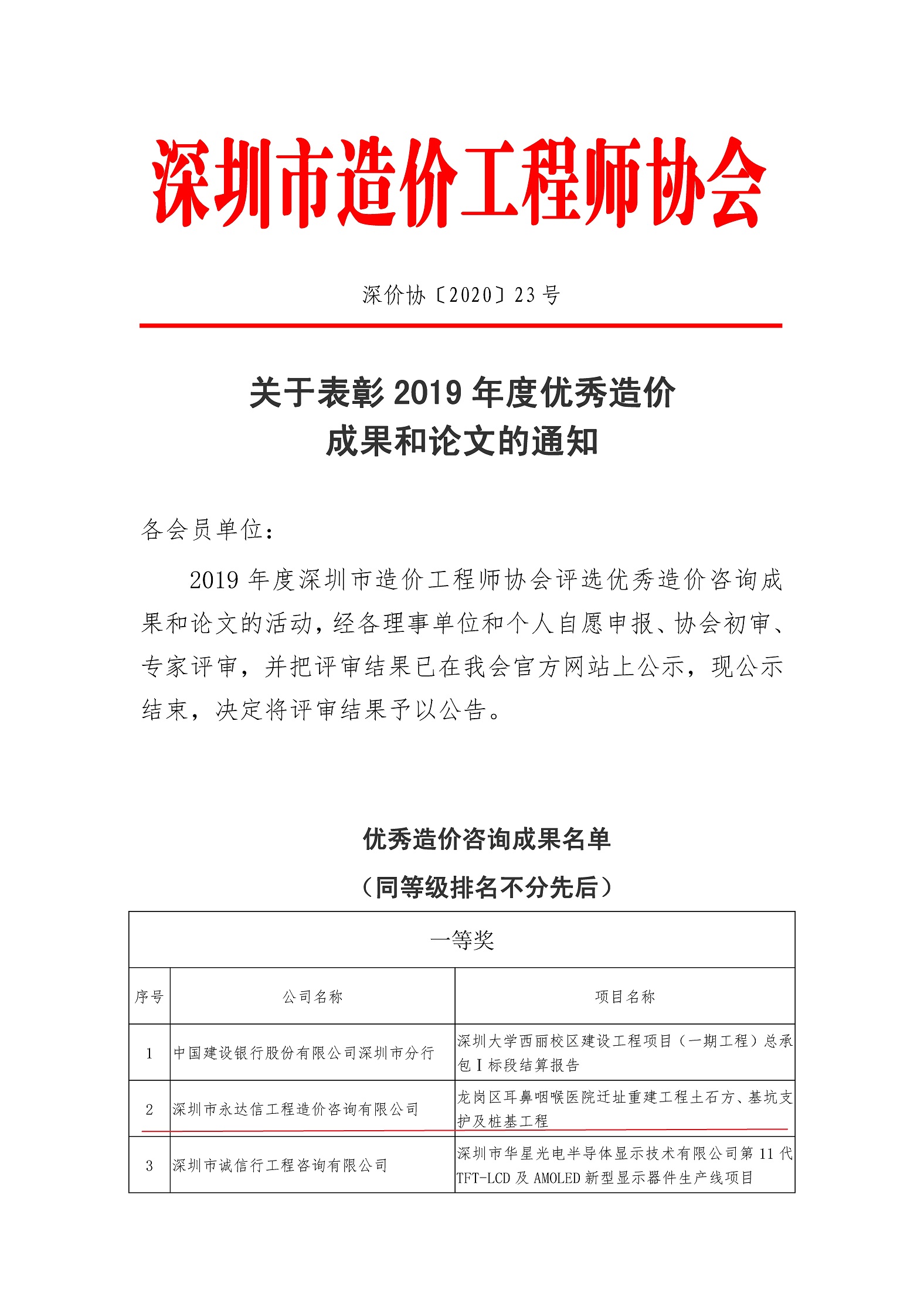 1、我司荣获深圳市造价咨询行业2019年度先进单位;