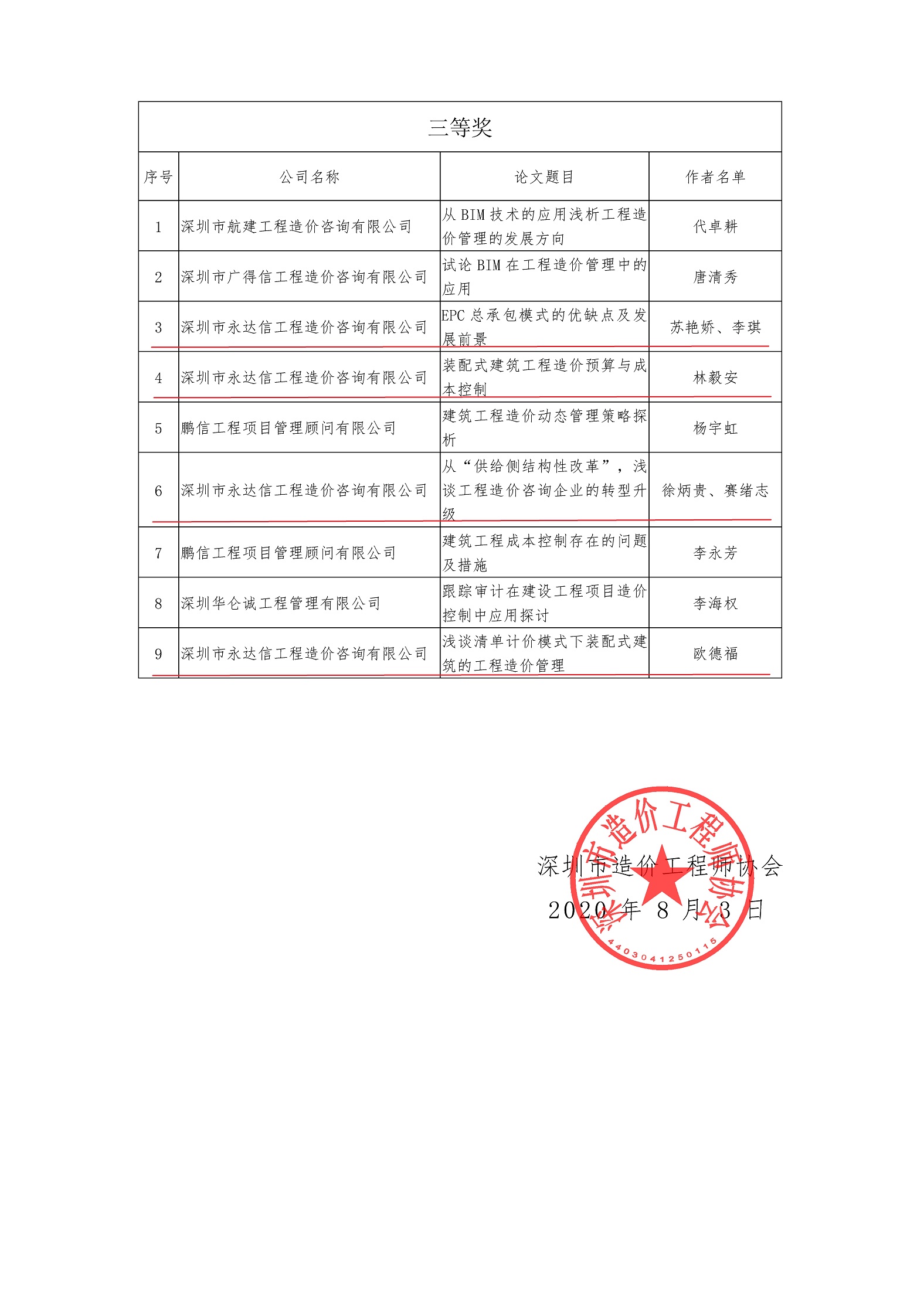 “EPC总承包模式的优缺点及发展前景”、“装配式建筑工程造价预算与成本控制”、“从供给侧结构性改革浅谈工程造价咨询企业的转型升级”、“浅谈清单计价模式下装配式建筑的工程造价管理”荣获深圳市造价咨询行业2019年度优秀造价咨询论文三等奖