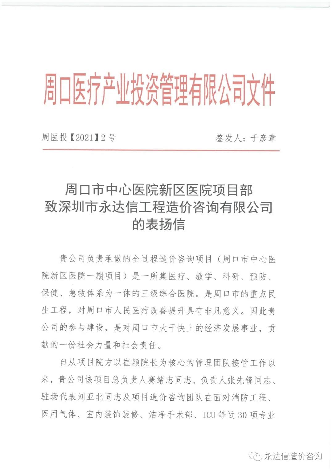 日前,由我司承作的周口市中心医院新区医院项目,在项目总负责人赛绪志同志、负责人张先锋同志、驻场代表刘亚北同志及项目造价咨询团队的共同努力下,成绩显著,创造出良好的服务质量与口碑,获得业主单位通报表扬。