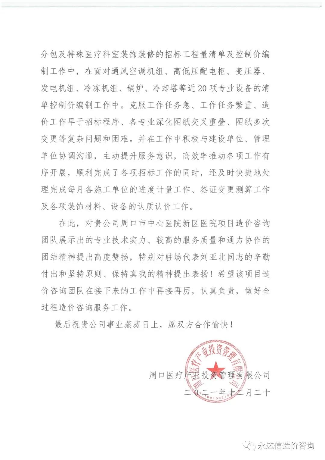 获此殊荣,是对我司造价咨询工作的高度肯定。永达信全体成员将再接再厉,不断提高专业技术水平,为业主单位提供更加专业、优质的专业服务。