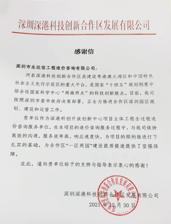 近日,我司收到业主深圳深港科技创新合作区发展有限公司发来的感谢信,对我司在深港科创开放创新中心项目的服务表示由衷的感谢,对一线同仁的辛勤付出予以高度的表扬。