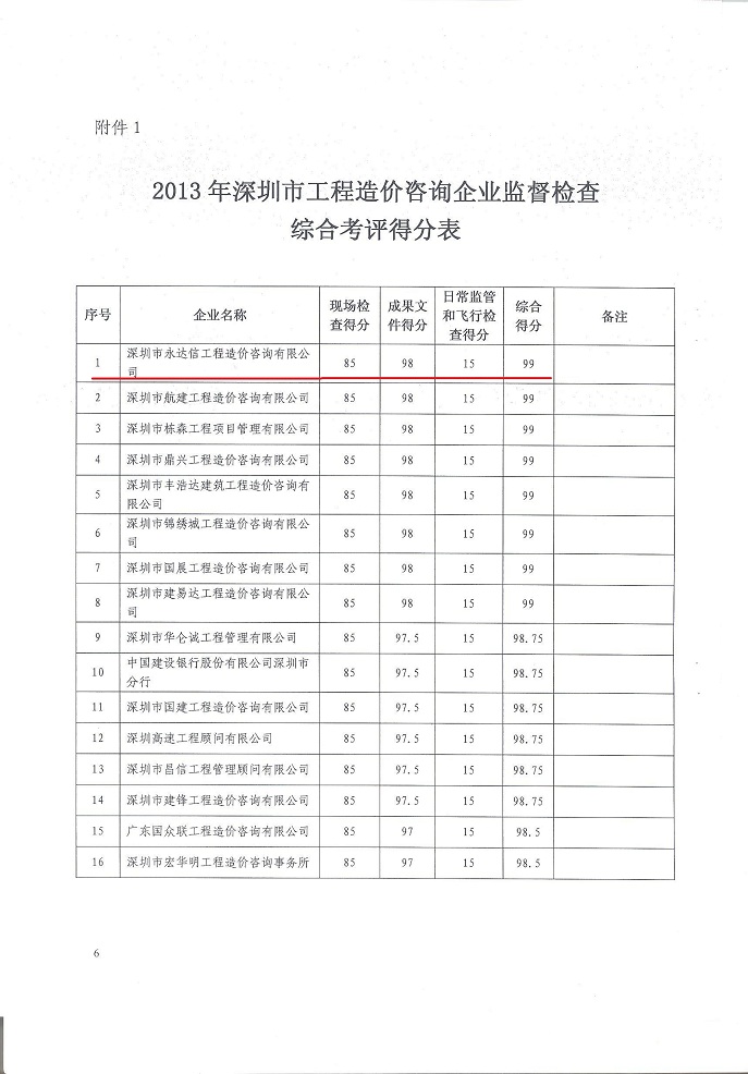 本次检查我站共成立4个现场检查组和1个成果文件检查组。6月18日至7月3日,现场检查了各造价咨询企业的资质、人员和经营管理等情况,并抽取工程造价成果文件78份(检查的83家企业中,有4家资质过期,1家无执行深圳计价标准的成果文件);7月3日至11月15日,检查了抽取成果文件的合法性和准确性。现场检查和成果文件检查结束后,根据《深圳市建设工程造价管理站关于开展2013年全市工程造价咨询企业执法检查的通知》规定的考评方式对各受检企业进行了综合考评(综合考评结果详见通报附件1)。检查结果表明,我市造价咨询行业的整体发展状况良好,主要体现在: